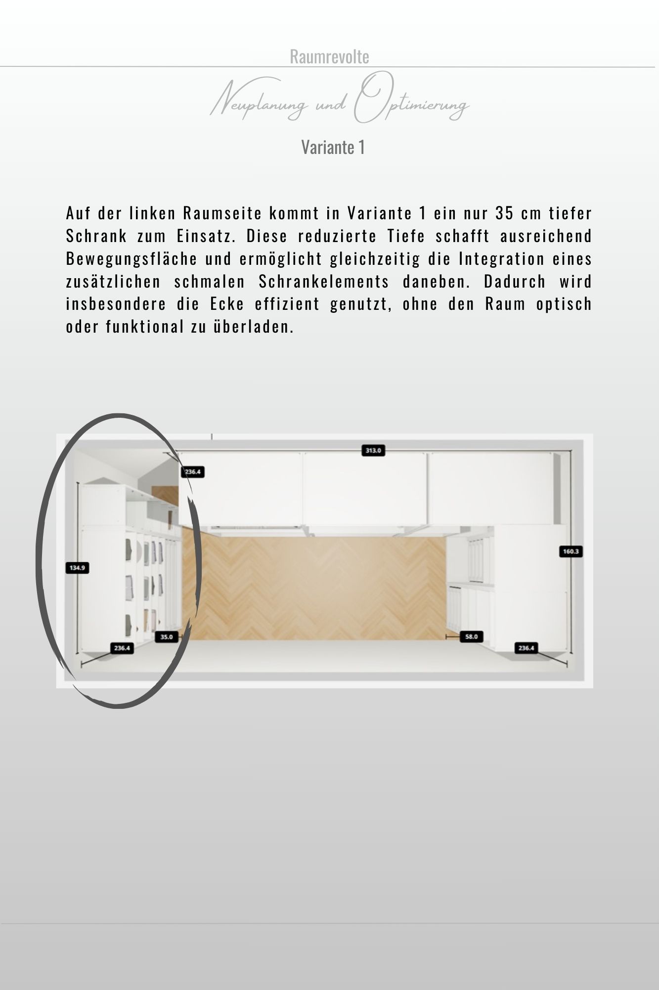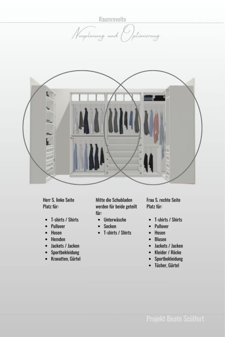 Im Rahmen der Möblierungs- und Stauraumplanung wurde eine neue Schranklösung entwickelt, die den Raum vollständig ausnutzt und gleichzeitig eine angenehme Bewegungsfreiheit gewährleistet. Dabei wurden unterschiedliche Schranktiefen, Hänge- und Ablagebereiche sowie individuelle Bedürfnisse der Nutzer berücksichtigt.
