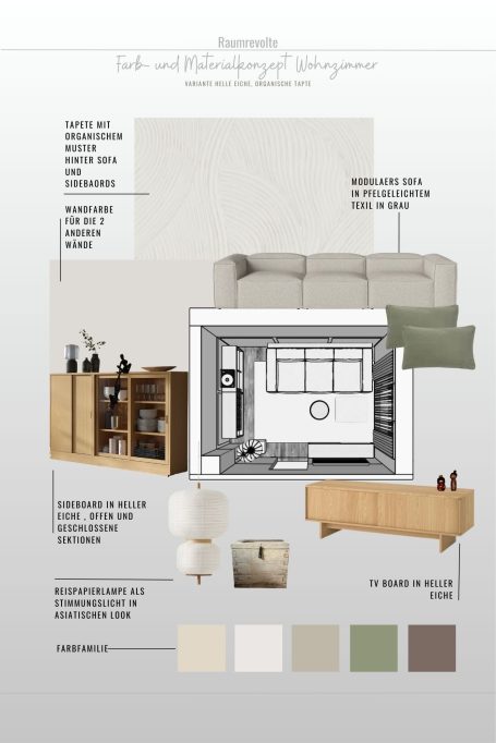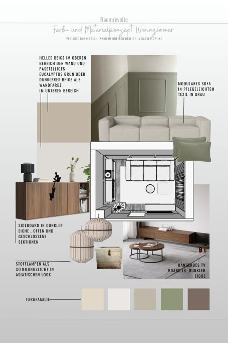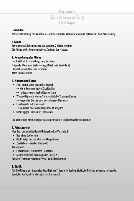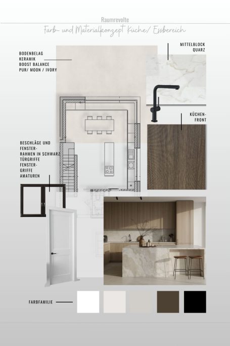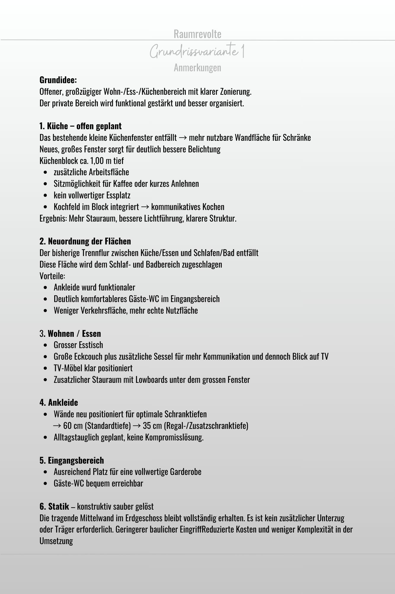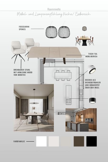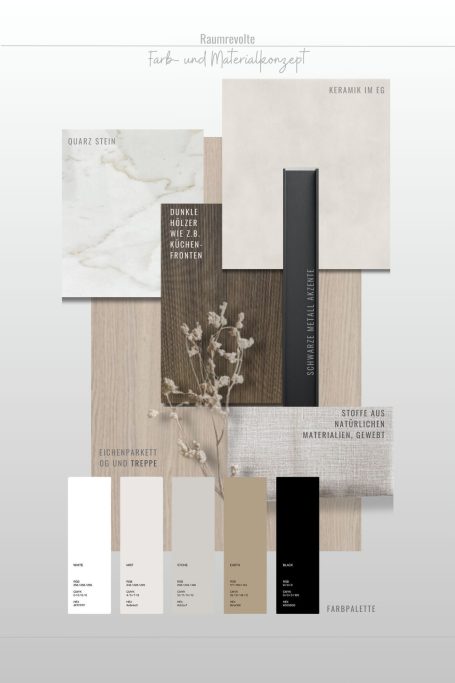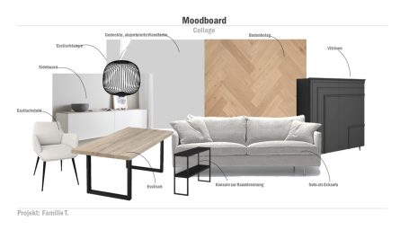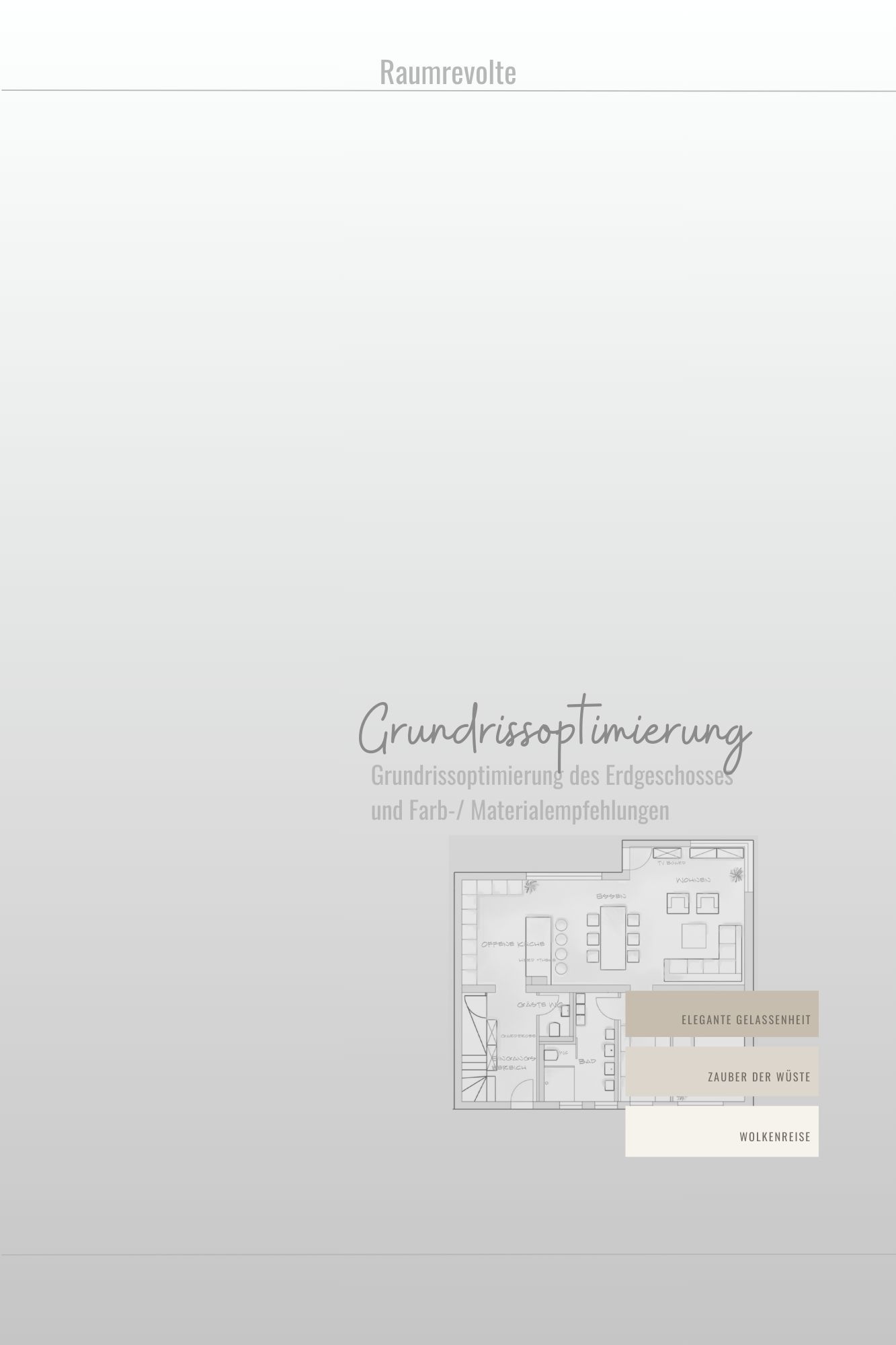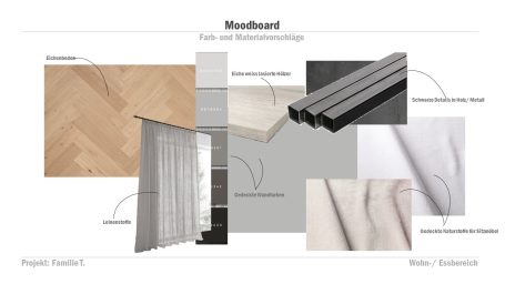 Im Rahmen der Raumplanung wurden mehrere optimierte Grundrissvarianten entwickelt. Ergänzend entstand ein individuelles Farb- und Materialkonzept sowie ein Moodboard als Grundlage für die spätere Umsetzung.