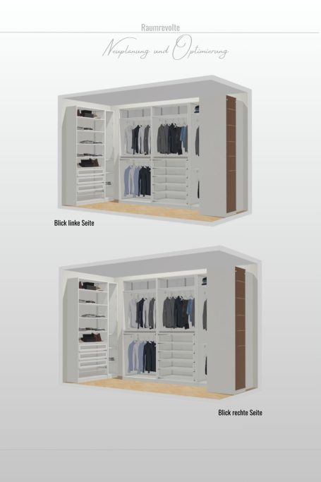 Der vorhandene Raum bot zwar Potenzial für eine Ankleide, war jedoch in seiner Nutzung ineffizient. Schranktiefen, Ecksituationen und Laufwege führten dazu, dass wertvolle Fläche ungenutzt blieb und kein klar strukturiertes Ordnungssystem entstand.